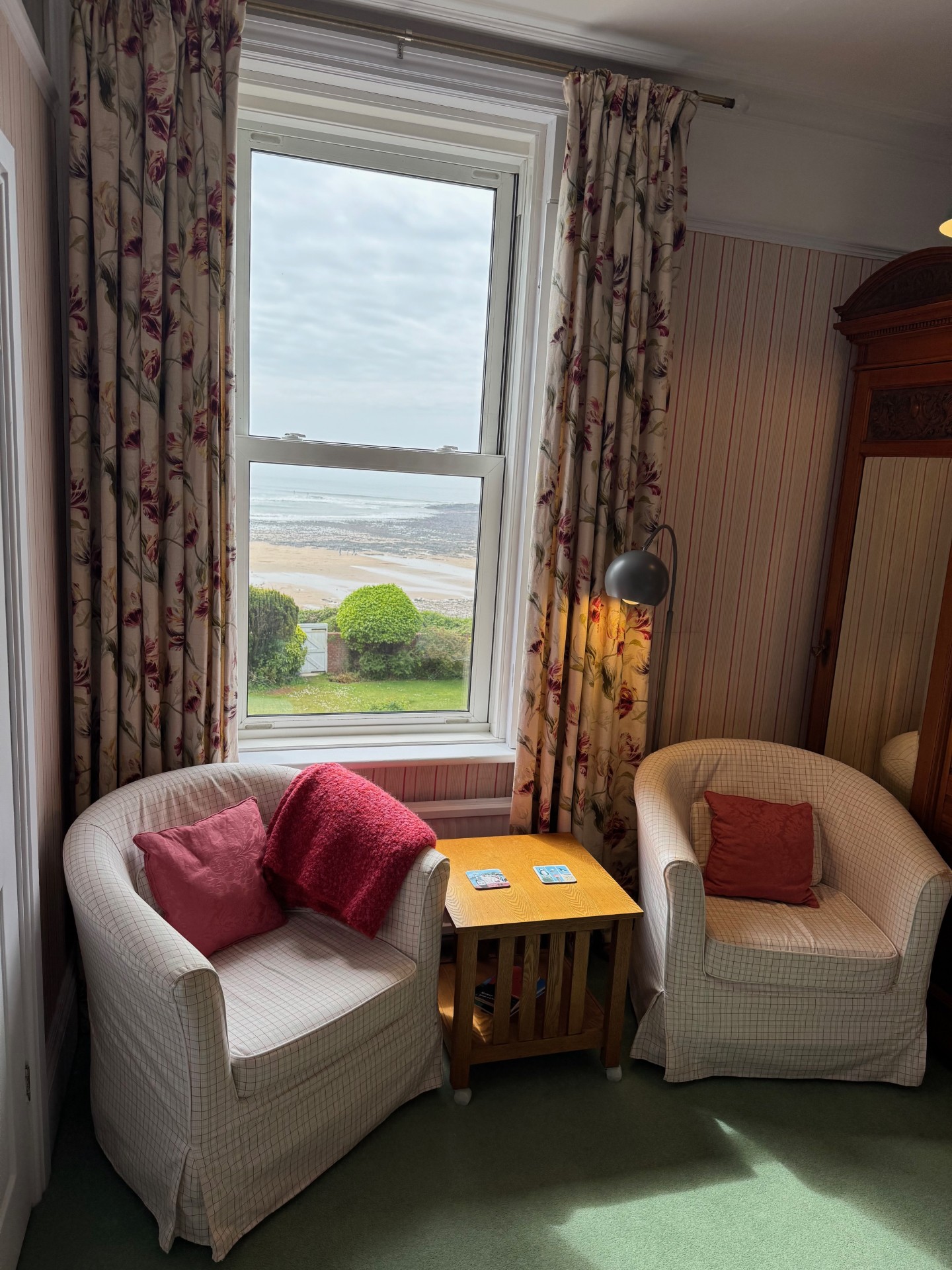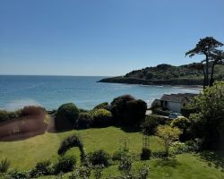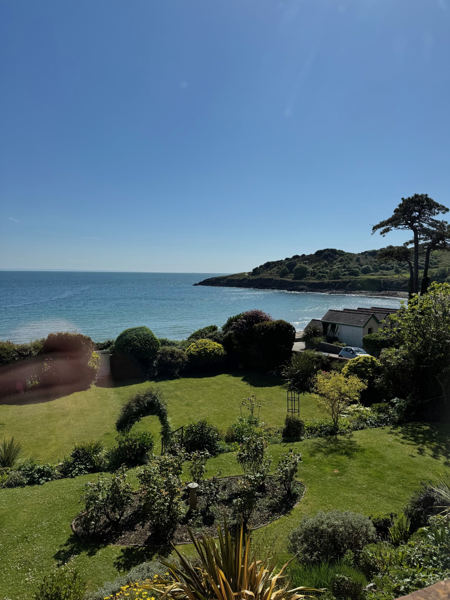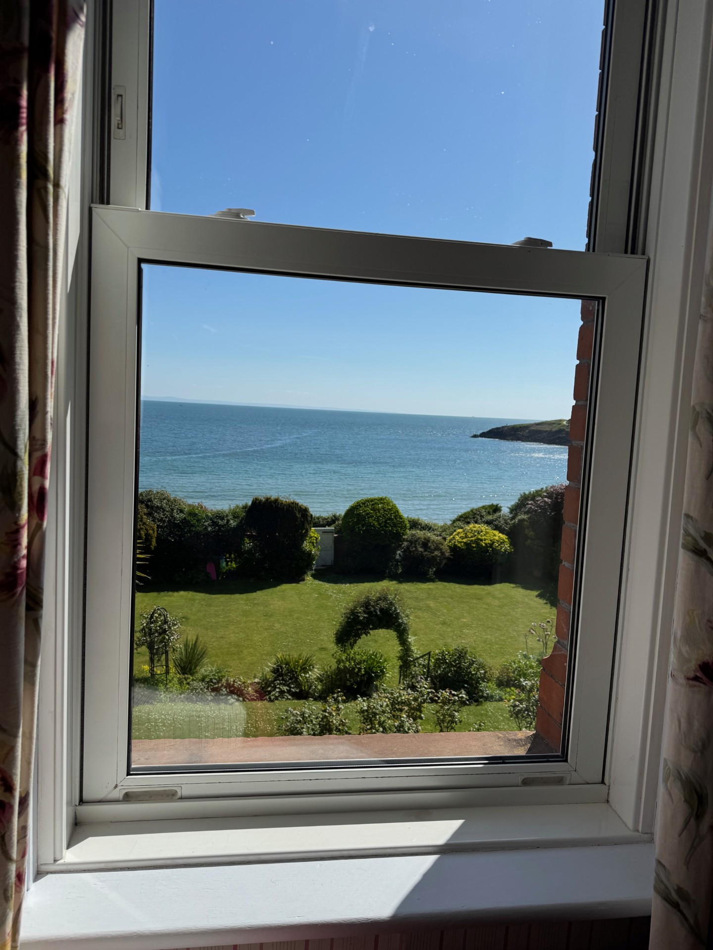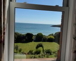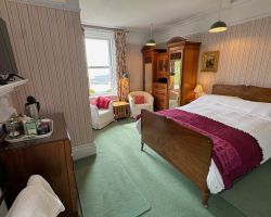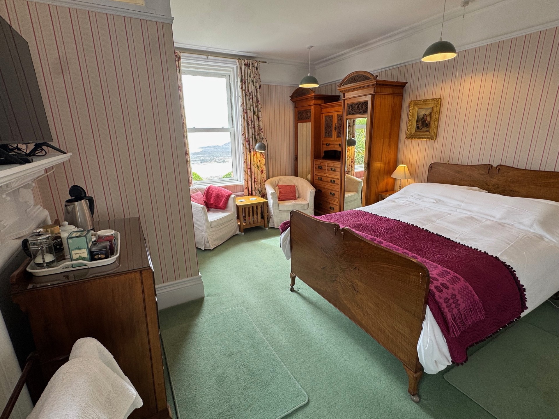 A spacious and comfortable bedroom with a king size bed, the room has views over the garden and out to sea.